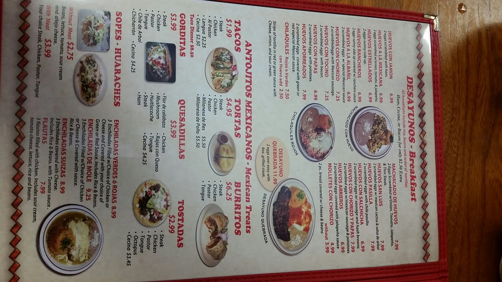 includes beans, cheese, sour cream, lettuce, tomato and avocado pork. steak, beef tongue or barbacoa, brad steak or bread steak or bread chicken